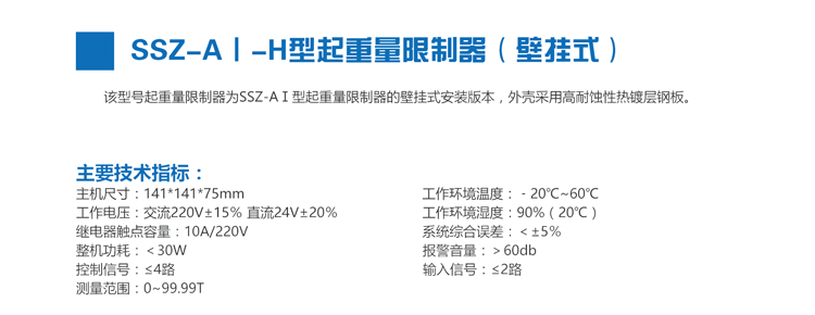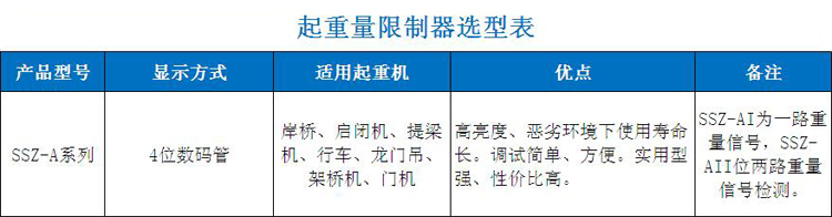 產(chǎn)品詳情 功能介紹 產(chǎn)品優(yōu)勢 產(chǎn)品參數(shù) 包裝清單 產(chǎn)品詳情 該型號起重量限制器為SSZ-A(Ⅰ/Ⅱ)-H型起重量限制器的壁掛式安裝版本,外殼采用高耐腐蝕性防水壓鑄鋁合金。Ⅰ型和Ⅱ型分別適用于一路和兩路信號輸入的起重機。 功能介紹 產(chǎn)品優(yōu)勢 產(chǎn)品參數(shù) 包裝清單