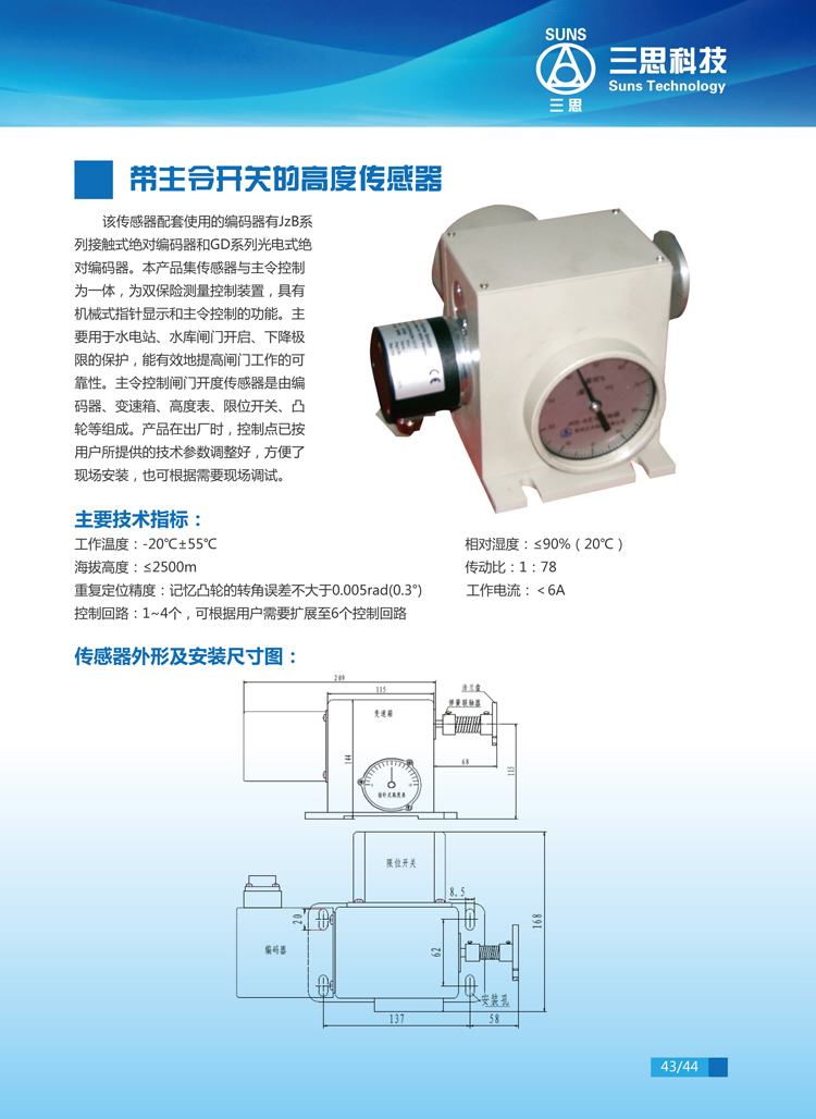 該傳感器配套使用的編碼器有JzB系列接觸式絕對編碼器和GD系列光電式絕對編碼器。本產(chǎn)品集傳感器與主令控制為一體,為雙保險(xiǎn)測量控制裝置,具有機(jī)械式指針顯示和主令控制的功能。主要用于水電站、水庫閘門開啟、下降極限的保護(hù),能有效地提高閘門工作的可靠性。主令控制閘門開度傳感器是由編碼器、變速箱、高度表、限位開關(guān)、凸輪等組成。產(chǎn)品在出廠時(shí),控制點(diǎn)已按用戶所提供的技術(shù)參數(shù)調(diào)整好,方便了現(xiàn)場安裝,也可根據(jù)需要現(xiàn)場調(diào)試。