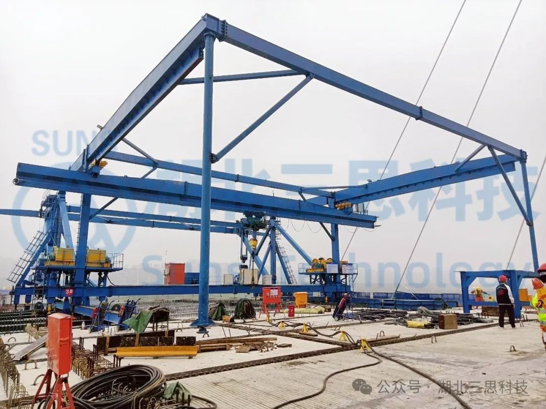 湖北三思科技此次參與的是一臺(tái)起重能力達(dá)900T的運(yùn)架一體機(jī),設(shè)備位于湖南某橋梁建設(shè)現(xiàn)場。